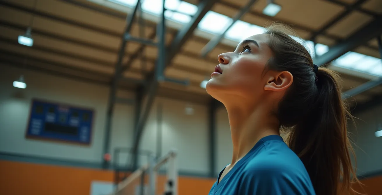Le problème le plus emblématique du passage en salle est la perte de perception de la profondeur, particulièrement sur les balles hautes. En extérieur, le ciel offre un fond uni et infini qui permet au cerveau d’isoler facilement le ballon et d’évaluer sa trajectoire. Dans un gymnase, le ballon se déplace devant un arrière-plan complexe : une charpente métallique, des gaines de ventilation, des rangées de projecteurs, des tribunes lointaines. Cet « encombrement visuel » perturbe les mécanismes de perception de la profondeur et de la vitesse. Le ballon semble accélérer, ralentir, ou « tomber » soudainement, car le cerveau peine à le dissocier de l’arrière-plan. La hauteur réglementaire d’un plafond de volley (minimum 7 mètres, mais souvent 12,5 mètres ou plus en compétition) amplifie ce sentiment de perte dans un volume immense.